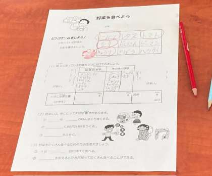 区内の栄養教諭の方に来ていただき、「野菜を食べよう」の学習をしました。知っている野菜のビンゴゲームをしたり、献立に使われている野菜を緑黄色野菜とその他の野菜に分けたりしました。野菜のはたらきを学び、野菜をたくさん食べる方法を考えました。