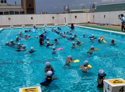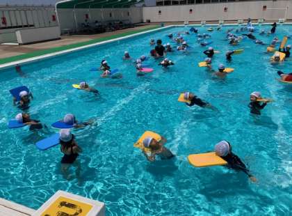 1年生がビート板を使って浮く運動遊びをしました。ラッコうき、ビート板を頭に敷いて浮く、お尻に敷いて浮くなど楽しくできました。
