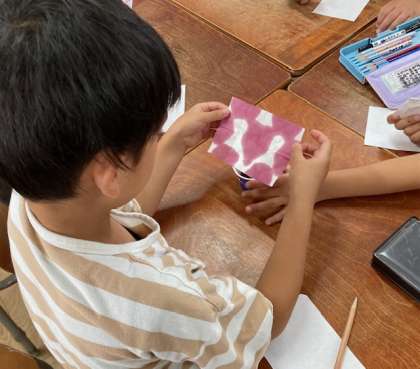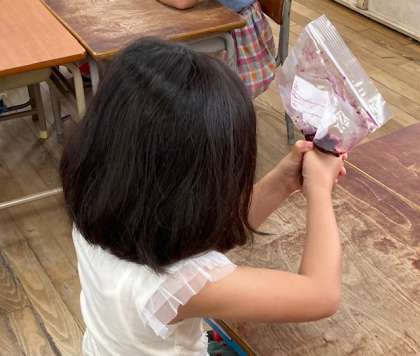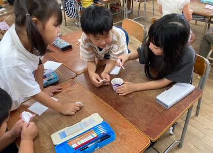 1年生が育てているあさがおを使って、あさがおの色水あそびをしました。あさがおの花をしぼり色水を出し、カップに入れました。その色水に四角形の紙を折って色水につけて開いてみると、おもしろい模様ができあがりました。