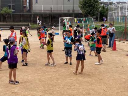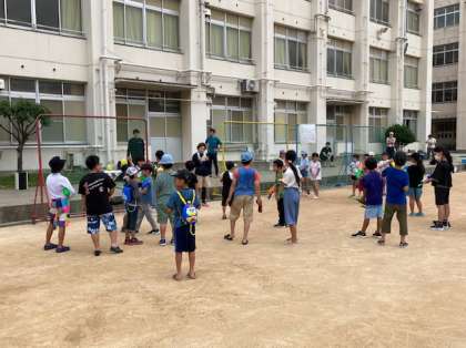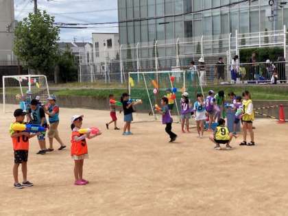 PTAの企画による「水遊びプロジェクト」として、水鉄砲で遊びました。参加者は自慢の水鉄砲を持って、水のかけあいをしました。大人も童心にかえり、とても楽しく遊ぶことができました。