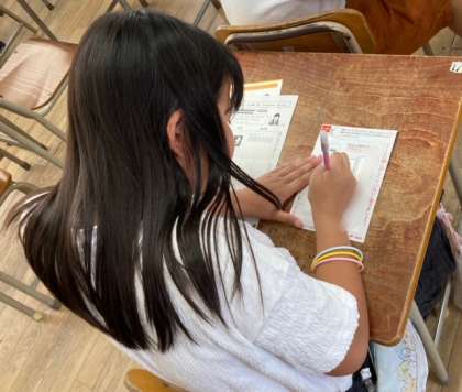 2年生がはがきの書き方を学習しました。お家の人に書いてもらった宛名を見て、はがきに宛名を書く練習をしました。この夏休みに誰にはがきを出すのでしょうか。楽しみです。