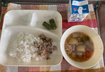 献立は、豚肉とじゃがいもの煮もの、オクラの梅風味、ツナっぱいため、ご飯、牛乳です。