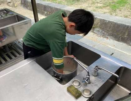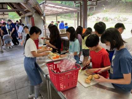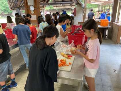 今日のお昼ごはんは、野外炊飯で作るカレーライスです。にんじん、玉ねぎ、じゃがいもを切りました。お米を洗い、水の量を手のくるぶしまで入れました。