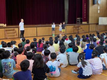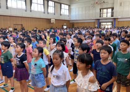 4年生代表3名の児童が2学期の目標を発表し、最後は講堂に響き渡る元気な声で校歌を歌いました。子どもたちのやる気が強く感じられる歌声でした。2学期も毎日の学校の様子をホームページにアップしますので、ご覧ください。