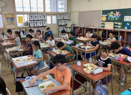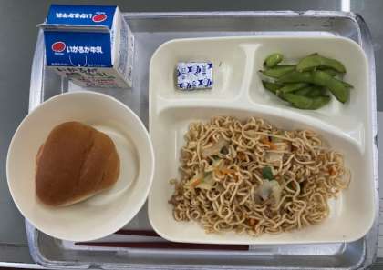 献立は、オイスターソース焼きそば、えだまめ、固形チーズ、ミニ黒糖パン、牛乳です。今日は、2学期最初の給食です。おいしくいただきました。