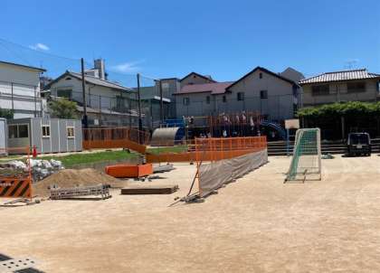2学期より令和6年2月15日まで、1年、2年、5年、3年3組の教室がある東校舎と渡り廊下の外壁補修工事を行います。今日から工事用の足場を組むための準備に入りました。しばらくは運動場が工事のために少し狭くなりますが、子どもたちが安全に遊ぶことができるようにしていきます。