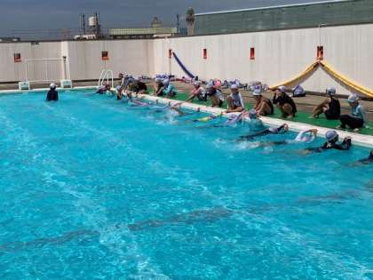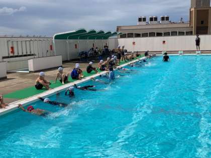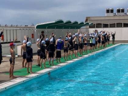 3年生の水泳学習は、面かぶりクロールをしました。最初はプールサイドで、腕のかきをしました。太ももに親指がすれるくらい大きく腕を回しました。その後は、プールに入り、壁を持って腕のかきを練習しました。
