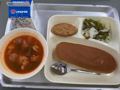 献立は、チキンレバーカツ、ケチャップ煮、グリーンアスパラガスとキャベツのサラダ、黒糖パン、牛乳です。