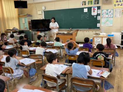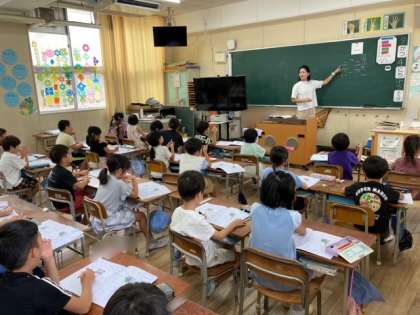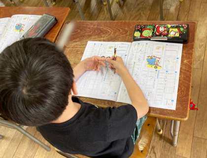 1年生が漢字の学習を始めました。1学期にひらがなとカタカナを学習しました。2学期からは漢字の学習が始まります。漢字の学習帳を使って、「一」と「ニ」の漢字を学習しました。漢字の学習帳をお家でも見てあげてください。
