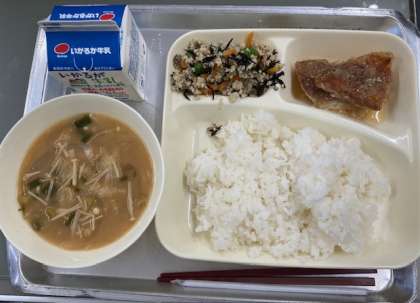 献立は、あかうおのおろしじょうゆかけ、みそ汁、高野どうふのいり煮、ご飯、牛乳です。