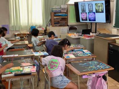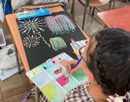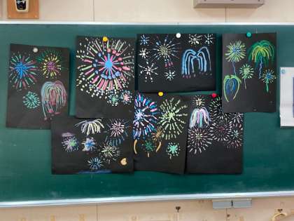 3年生が黒い画用紙に花火の絵を描きました。菊の花火、柳の花火、牡丹の花火など、カラフルな花火が夜空に立ち上げられた様子を描きました。