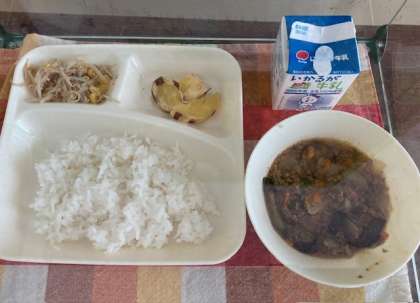 献立は、マーボーなす、ツナと野菜のいためもの、焼きさつまいもの甘みつかけ、ご飯、牛乳です。