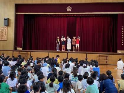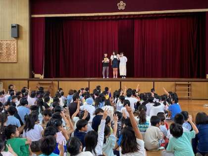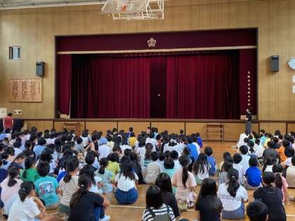 本日の児童集会は、舞台の幕の間を通った物を当てるゲームをしました。ドッチボールや筆箱などが、幕の隙間を通りました。子どもたちは何が通ったかを当てようと、集中して舞台に注目していました。