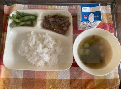 献立は、プルコギ、トック、えだまめ、ご飯、牛乳です。