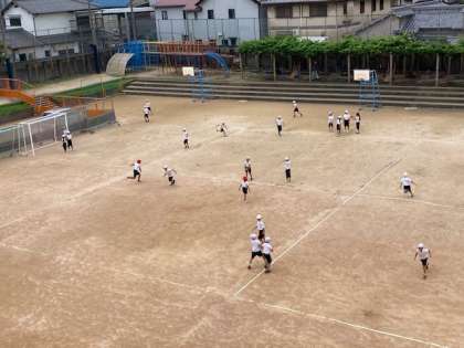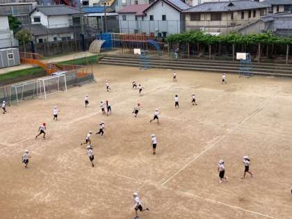水泳学習が終わり、久しぶりの運動場での体育です。みんなで鬼ごっこをして、運動場を走りまわりました。