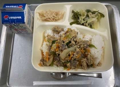 献立は、他人丼、ささみと野菜のいためもの、もやしの甘酢あえ、ご飯、牛乳です。