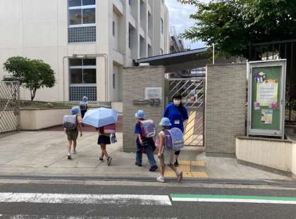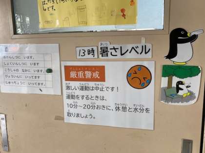 昨日から教育実習生が来ました。今日は玄関で子どもたちの登校を見守りました。まだまだ暑いので、日傘をさして登校する児童もいます。また、保健室前には暑さレベルを掲示して、子どもたちに注意を促しています。