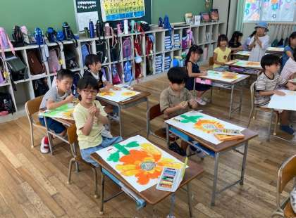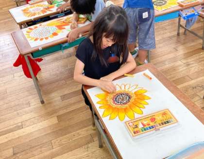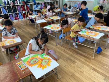 1年生がひまわりの絵を描いています。オレンジと黄色で花びらを、葉は緑と黄緑色、種は黒や茶色を使って上手に色をなりました。大きなのびのびとしたひまわりを描いています。