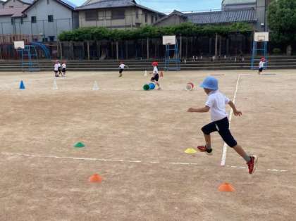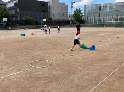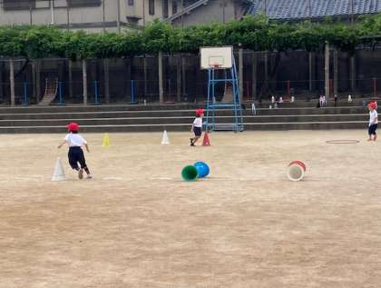 1年生が「走の運動遊び」をしました。コーンや輪などの低い障害物を走りこえたり、ジグザグに走ったりしました。