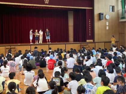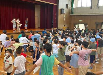 今日の児童集会は、ヒントを3つ出して、何かを当てる3択クイズをしました。選択肢で1はTのポーズ、2は腰に手をあてるポーズ、3はVサインをして手を前に出すポーズをしました。楽しくクイズができました。