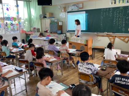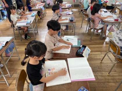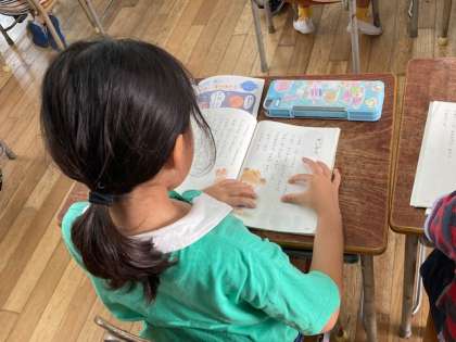 1年生が国語「かいがら」を学習しています。文章を理解するには、すらすらと音読できる必要があります。親指と人差し指を使って読む言葉を囲いながら、音読をしました。
