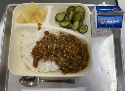 献立は、米粉の大豆入りキーマカレーライス、きゅうりのサラダ、洋なしの缶詰、牛乳です。