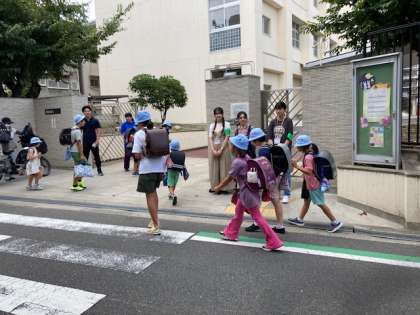 今日は、丸山小学校の近くにある短期大学の学生さんが、正門に立ちあいさつ運動をしてくれました。これから月に1、2回学生さんが登校指導をしてくれます。子どもたちのあいさつが元気になりました。