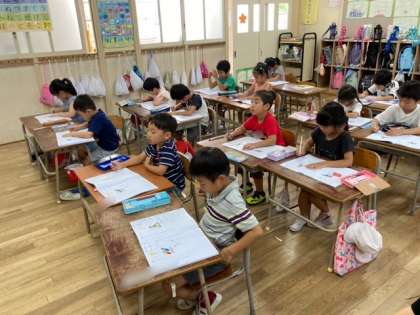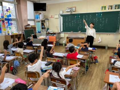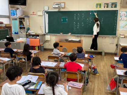 1年生が漢字「九」「十」を学習しました。書き順、読み方、言葉作り、文づくりを漢字練習ノートを丁寧に書きました。書き終わると手を挙げて、先生にチェックしてもらって丸をつけてもらいます。