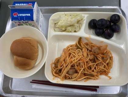 献立は、イタリアンスパゲッティ、キャベツのバジル風味サラダ、ぶどう(巨峰)、ミニ黒糖パン、牛乳です。