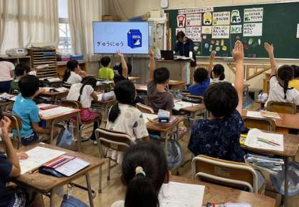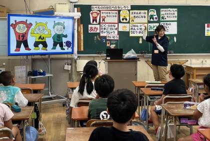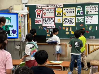 区内の栄養教諭の方から、食べ物のはたらきについて栄養指導をしてもらいました。食べ物には、赤(からだのもとになる)、黄(エネルギーのもとになる)、緑(からだの調子を整えるもとになる)の3つのはたらきがあることを学びました。