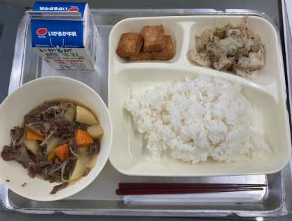 献立は、肉じゃが、あつあげのみそだれかけ、キャベツの赤じそあえ、ご飯、牛乳です。