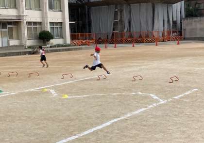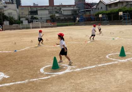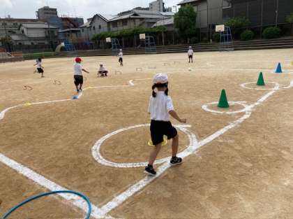 1年生の体育は、体を移動する運動遊びをしました。曲線、コーンを回る、小型ハードルを跳び越える、直線を走るコースを作り、様々な行い方で体を移動する動きを身につけることができるようにしました。