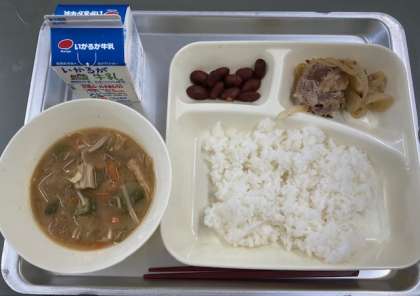 献立は、鶏肉の甘辛焼き、とうがんのみそ汁、金時豆の煮もの、ご飯、牛乳です。