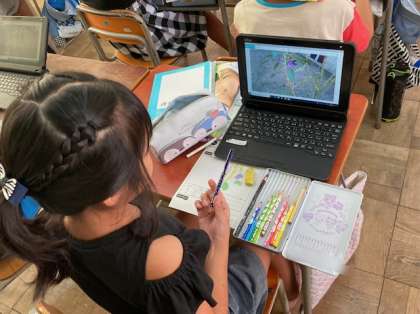 3年生が学習園で育てているホウセンカを観察し、タブレット端末で写真を撮りました。その写真を見ながら観察カードにまとめました。