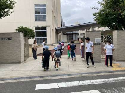 キリスト教短期大学の学生さん4名が、正門であいさつ運動をしました。大学と地域、学校が連携した取組です。月に数回あいさつ運動をします。