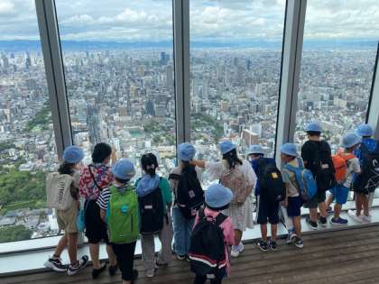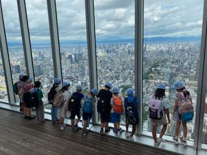 4年生が、あべのハルカスバックヤードツアーに行きました。雨水貯留そう、ガス吸収式冷温発生機、バイオガス設備を見学しました。また、約2億年前の地層の床でイカの化石を見つけました。最後は、展望台で大阪の街を見ました。