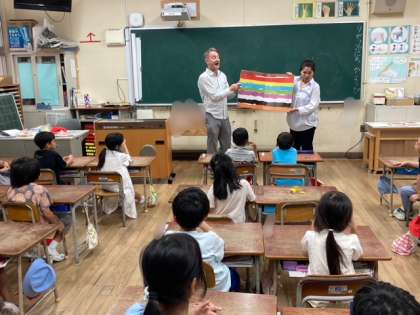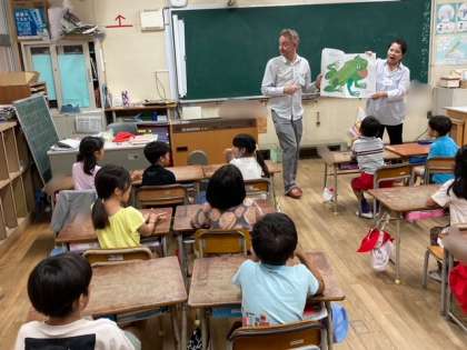 阿倍野区役所のグローバル人材育成支援事業として、1年生に英語レッスンをしてもらいました。大きな絵本を使って、講師の先生が動物の鳴き声をして、子どもたちが動物を当てます。そして、絵本をめくると色のついた動物が出てきます。それを英語で言います。恥ずかしがらずに大きな声で英語を言えてました。