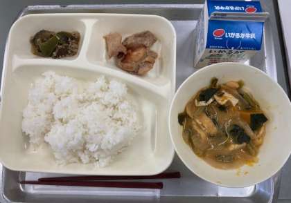 献立は、鶏肉のてり焼き、かぼちゃのみそ汁、なすのそぼろいため、ご飯、牛乳です