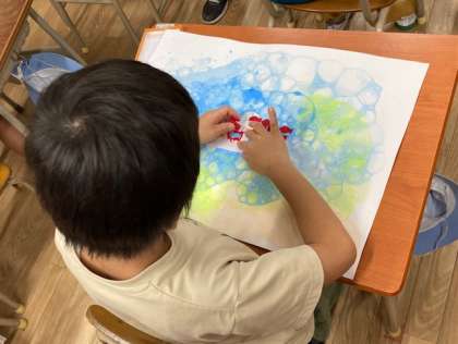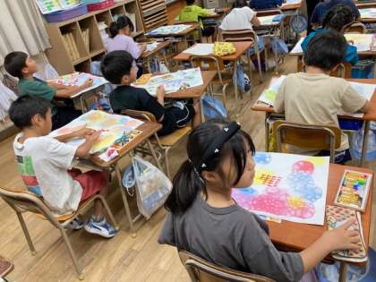 2年生がスイミーの絵を描いています。前時にシャボン玉で色づけした海の中に、パスで魚やクラゲ、伊勢海老、海藻などを描き入れました。型紙を作って、パスで色をつけている児童もいました。
