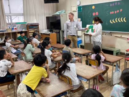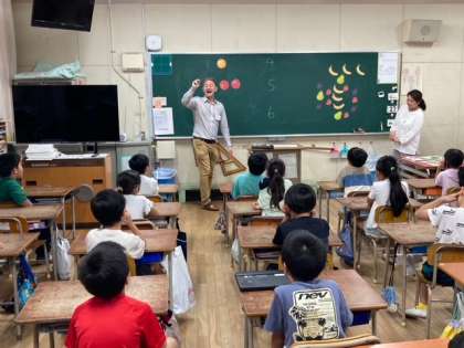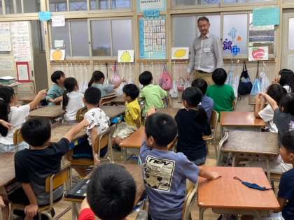 阿倍野区役所のグローバル人材育成支援事業として、2年生に英語レッスンをしてもらいました。講師の先生の発音を聴いて、果物の名前を言いました。その後、講師の先生が果物のイラストを教室のあちらこちらに置いて、果物の名前を言い子どもたちがどこに置いてあるかを示しました。とても楽しく英語に触れ合うことができました。また、果物の数を英語で言いました。最後は、子どもたちもよく知っている「はらぺこあおむし」の絵本を英語で聴い終わりました。