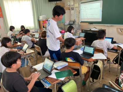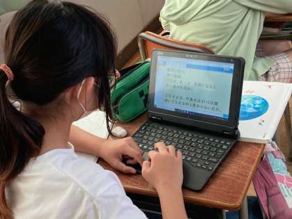 6年生が、国語「海のいのち」を学習しています。第一場面で、「なぜ、太一は漁師になりたいのか」などの課題を、タブレット端末に回答しました。みんなの回答を共有しています。まるでタブレット端末をノートのように活用しています。