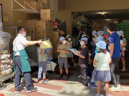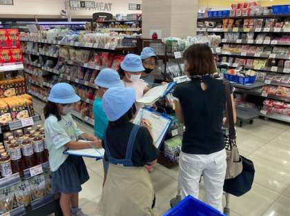 各学級、加工場と店内に分かれて、スーパーマーケットの見学をしました。加工場では、農産、畜産、水産、惣菜、パンの加工の様子を見学しました。店内では、「人にやさしい工夫」を見つけたり、お店の人やお客さんさんにインタビューをしたりしました。