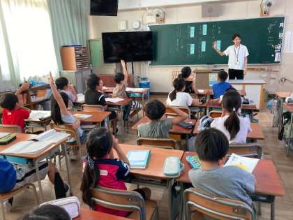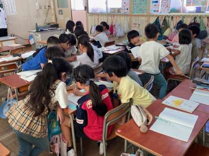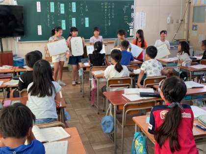 3年生が国語「くわしく表す言葉」を学習しました。班ごとにくわしく表す言葉を集めました。先生が主語と述語を言い、各班が「いつ、どこで、何を、どんな、何の、どのように」の言葉を選んで、全体で一つの文を作りました。