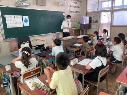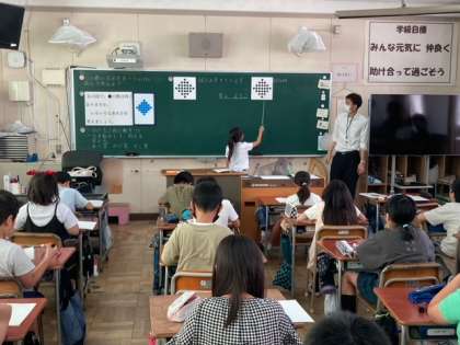 4年生が算数「ドットの数を色々な求める方で考えよう」を学習しました。同じ数のまとまりに注目して一つの式にまとめて、ドットの数を求めました。子どもたちは色々な考えを出し合い、発表することができました。