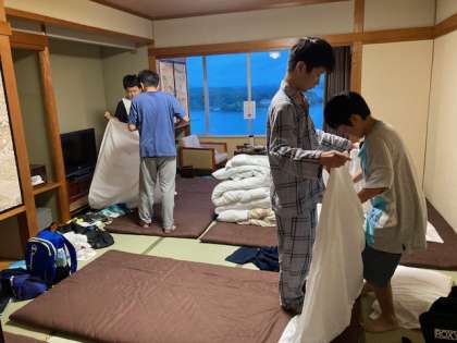起床後、布団をたたみ、荷物の整理をしました。全員、元気です。あいにく小雨の天気です。