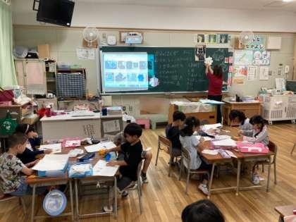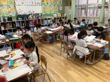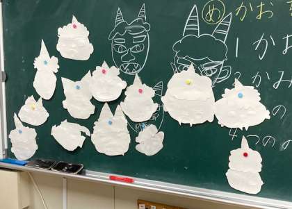 1年生が、かみはんがで鬼を作っています。顔の形、髪の毛、つの、まゆげ、目などを工夫して作っています。できあがりが楽しみです。