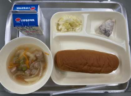 献立は、かつおのガーリックマリネ焼き、ウインナーとじゃがいものスープ、キャベツのサラダ、黒糖パン、牛乳です。