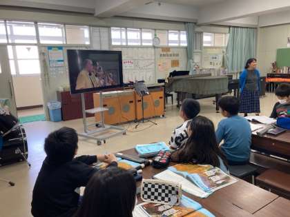 6年生の社会科では、室町文化を学習しています。能や狂言を知らない児童が多いので、動画を見て学習しました。4年生の音楽ではジャズの演奏動画を見て、金管楽器のトランペット、サックス、トロンボーンなどのすてきな音色を味わいました。