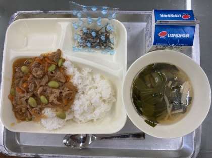 献立は、ピリ辛丼、中華スープ、ミニフィッシュ、牛乳です。