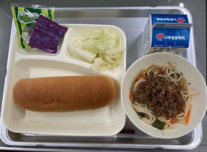 献立は、タンタンめん、あっさりキャベツ、まっ茶大豆、コッペパン、ブルーベリージャム、牛乳です。